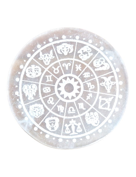 Selenit - Gravierte Zodiak-Scheibe zum Aufstellen.