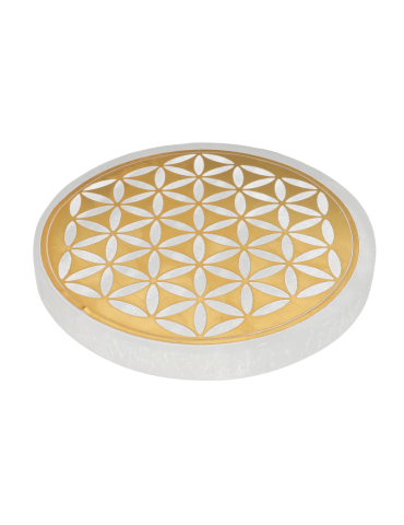 Selenit - Gravierte Blume des Lebens in Gold zum Aufstellen.