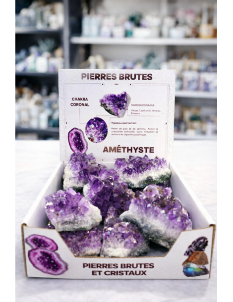 Présentoir animaux - 20 pièces Présentoir contenant ces 4 animaux : tortue, éléphant, chat et hiboux Mix de 5 variétés de pierres parmi : Améthyste, Aventurine verte, Cristal de Quartz, Howlite, Œil de Tigre et Quartz rose. Matériel : Présentoir en pvc Nombre de pièces : 20 pièces Taille : 20x16x20cm 🔗 Lien vers le réassortiment de produits compatibles