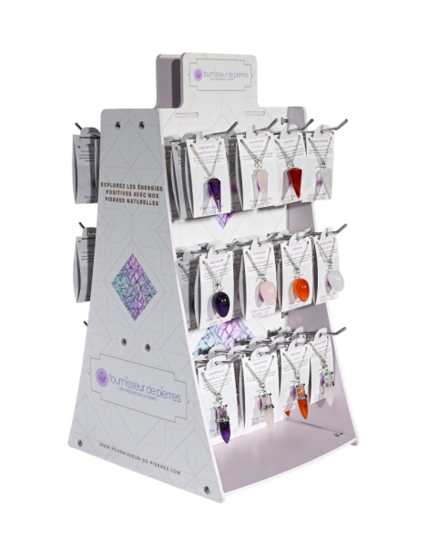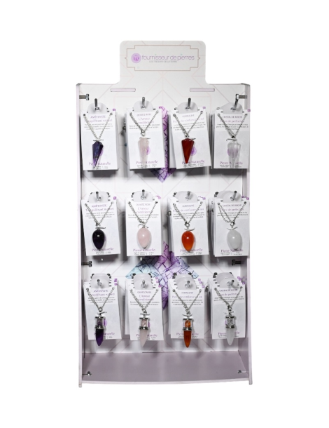 Présentoir contenant 48 pièces de chaque côté avec 8 variétés de pendentifs, 4 variétés de pendules facettes, oeufs et 8 variétés de bracelets 6mm parmi ces pierres : Améthyste, Aventurine Verte, Cornaline, Crystal de quartz, Howlite, Œil de tigre, Jaspe Rouge, Quartz rose.