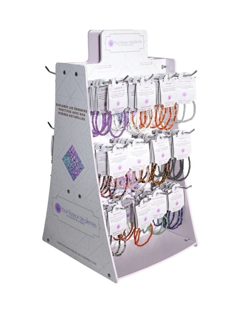 Children's Bracelet Display - 48 pieces Display containing these 12 varieties of Children's bracelets: Amethyst, Amazonite, Green Aventurine, Carnelian, Quartz Crystal, Red Jasper, Fluorite, Hematite, Howlite, Tiger's Eye, Black Tourmaline, and Rose Quartz. Display that can be hung on a wall (fixings included) or placed directly on a counter (movable...