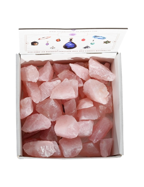 Espositore contenente pietre grezze in quarzo rosa.