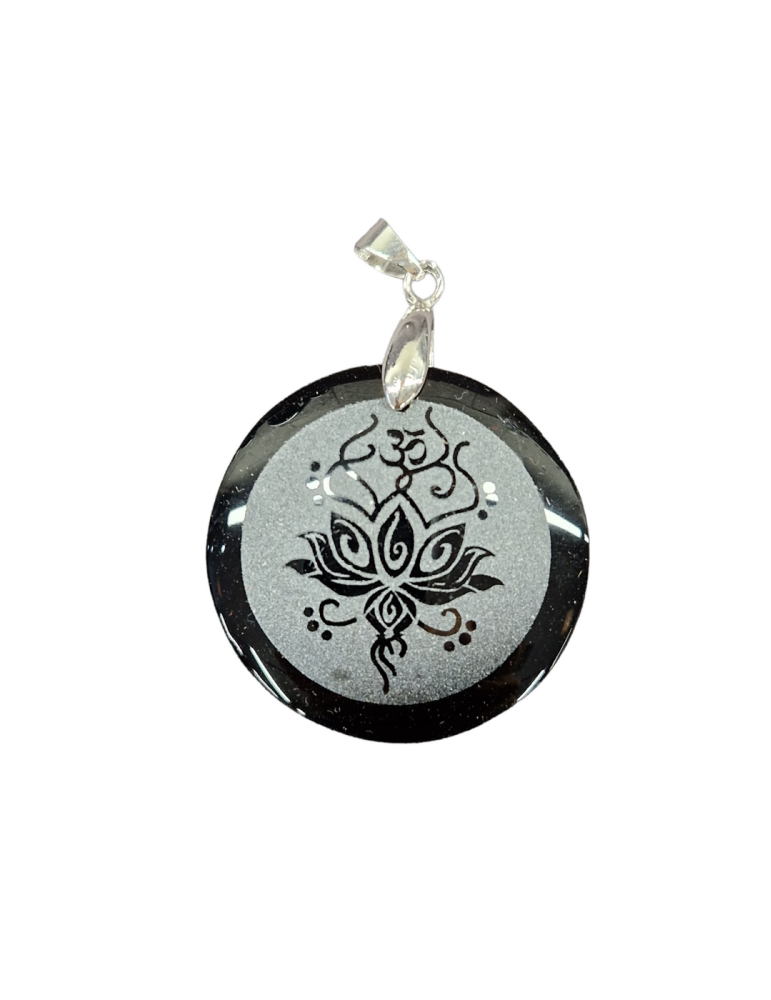 Pendente in ossidiana inciso con il simbolo del fiore di loto.