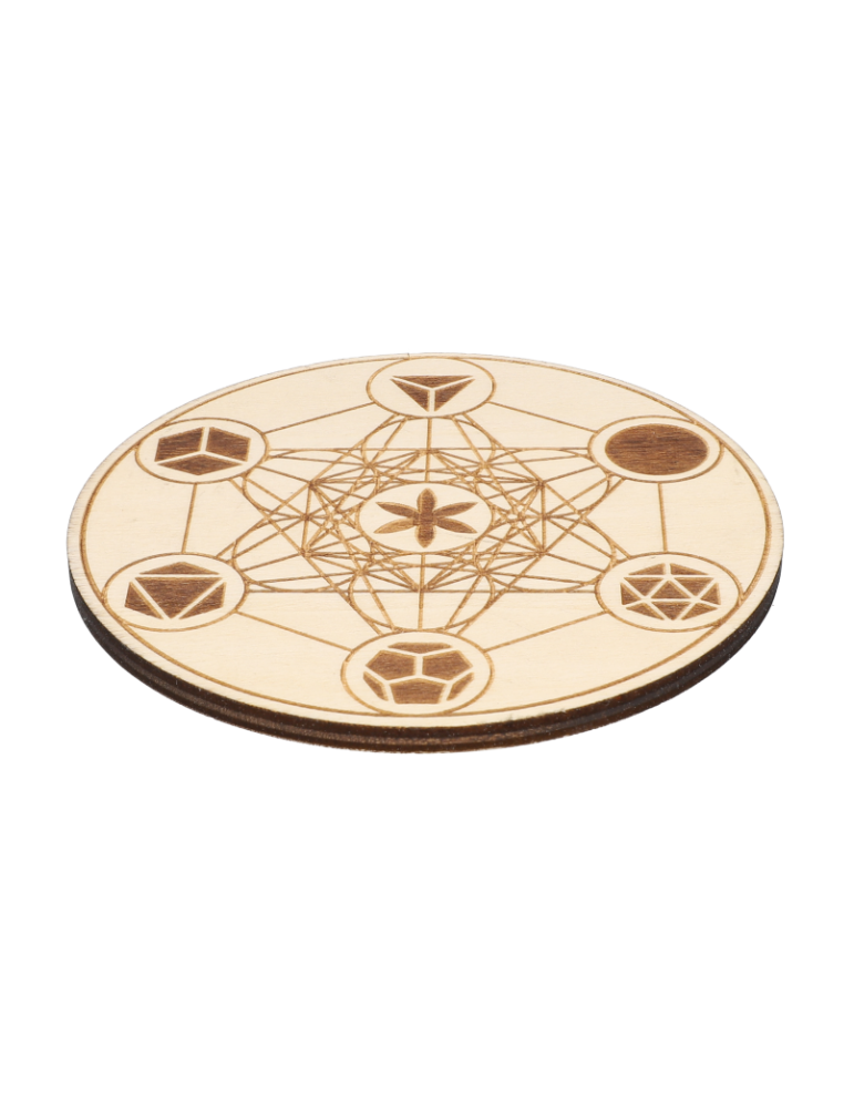 Houten schijf gegraveerd met Metatron en de Platonische lichamen