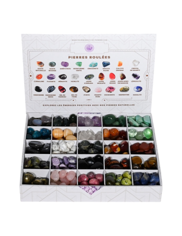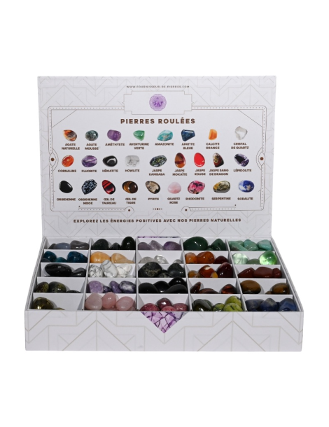 Expositor contendo 25 variedades diferentes de pedras roladas: Ágata Musgo, Ágata Natural, Amazonita, Ametista, Apatita Azul, Aventurina Verde, Calcita Laranja, Cornalina, Cristal, Fluorita, Hematita, Howlita, Jaspe Kambaba, Jaspe Mookaite, Jaspe Vermelho, Jaspe Sangue de Dragão, Lepidolita, Obsidiana, Olho de Boi, Olho de Tigre, Pirita, Quartzo Rosa, Rodonita, Serpentina e Sodalita.